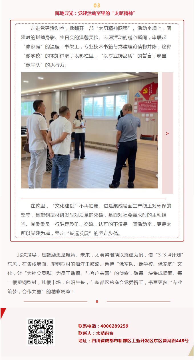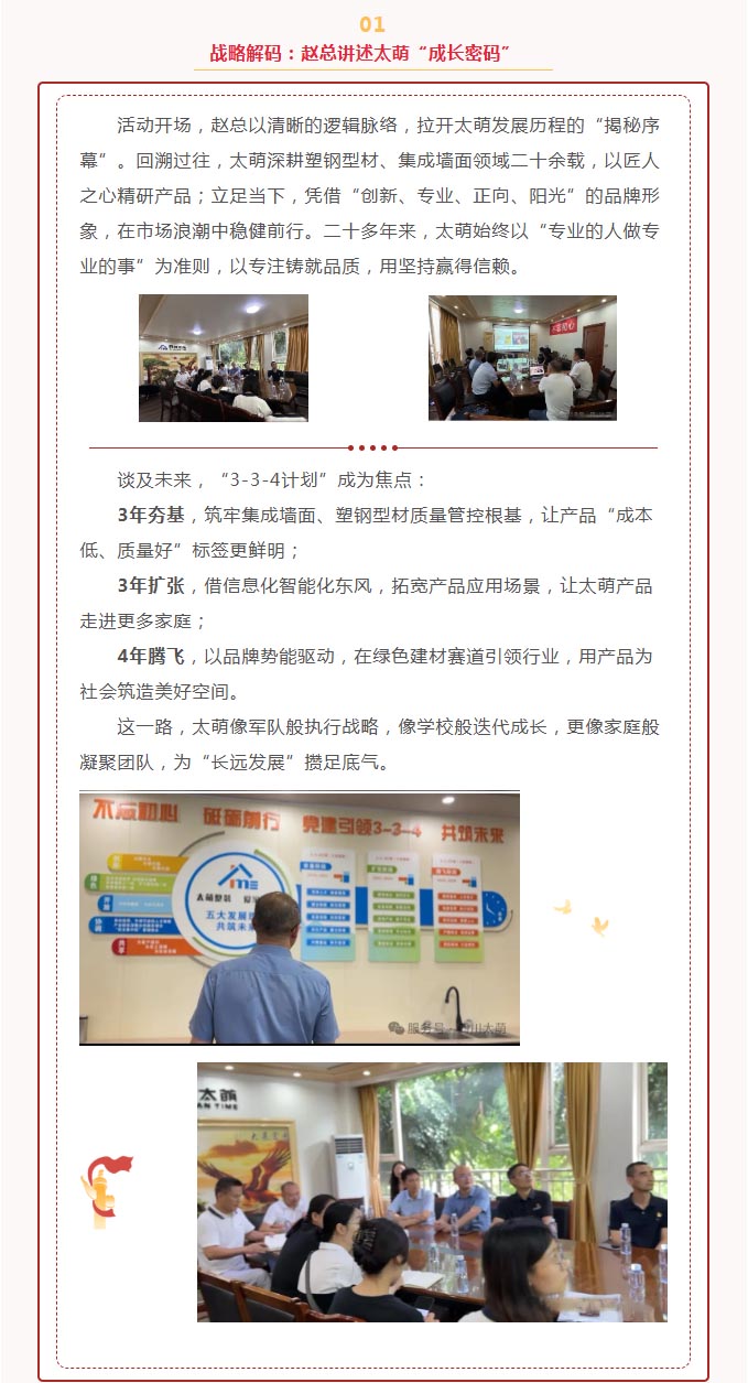 當八一軍旗在晨光中烈烈翻飛,四川太萌以“像軍隊、像學校、像家庭”的文化底色,與全體員工共慶建軍佳節。從軍人的鐵血擔當到企業的初心使命,從“有令必行”的紀律性到“戰之必勝”的執行力,太萌將軍旅精神融入每一塊集成墻面、每一根塑鋼型材,在“為社會貢獻、為員工造福、與客戶共贏”的道路上,續寫著屬于新時代企業的“強軍”篇章。 詳細>> - 匠心相遇,共筑美好|《夢想改造家》賴旭東老師一行蒞臨太萌選品考察 2025-07-30