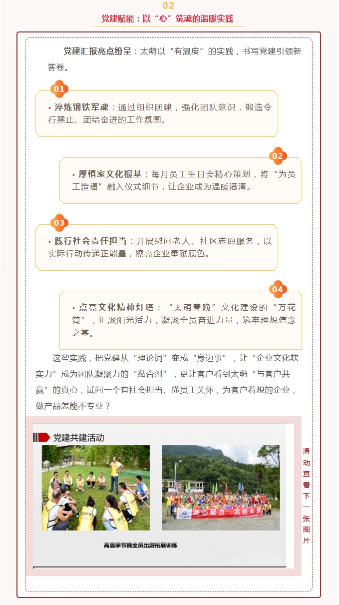 【概要描述】當六月的熱情與企業發展的熱忱相遇,四川太萌迎來一場意義非凡的交流!新都區總商會黨委委員一行蒞臨公司指導工作,為太萌在“像軍隊、像學校、像家庭”的企業文化滋養下,向著“為社會貢獻、為員工造福、與客戶共贏”使命奮進的征程,注入紅色動能。