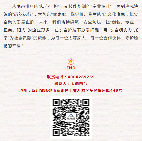 【概要描述】在四川太萌,安全是發展的基石,更是“為社會貢獻、為員工造福、與客戶共贏”使命的生動詮釋。當“像家庭、像學校、像軍隊”的企業文化融入安全管理,一場以“人人講安全、個個會應急--查找身邊安全隱患”為主題的安全行動,正為太萌的穩健前行筑牢消防安全防護墻。