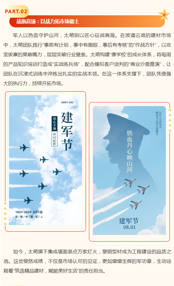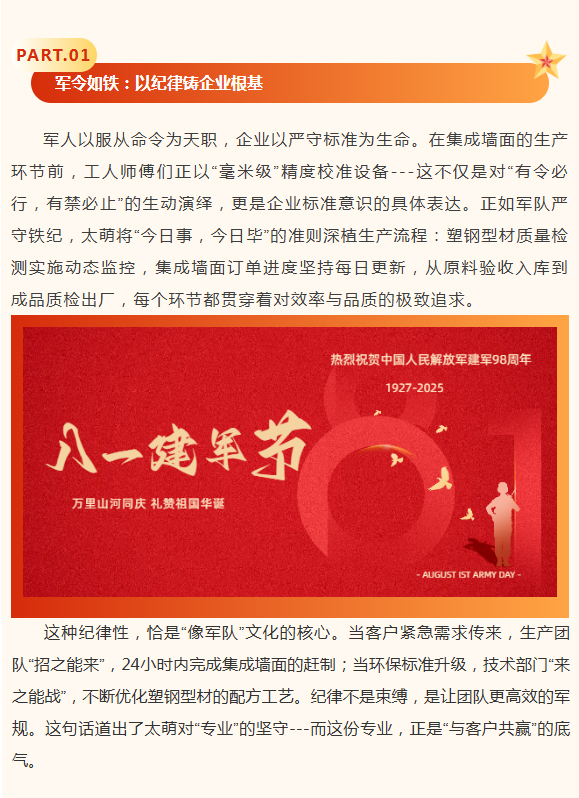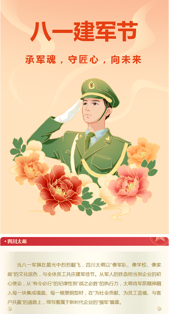 【概要描述】當八一軍旗在晨光中烈烈翻飛,四川太萌以“像軍隊、像學校、像家庭”的文化底色,與全體員工共慶建軍佳節。從軍人的鐵血擔當到企業的初心使命,從“有令必行”的紀律性到“戰之必勝”的執行力,太萌將軍旅精神融入每一塊集成墻面、每一根塑鋼型材,在“為社會貢獻、為員工造福、與客戶共贏”的道路上,續寫著屬于新時代企業的“強軍”篇章。