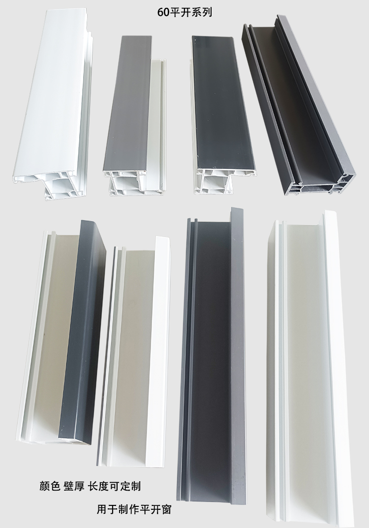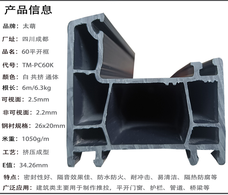 四川太萌塑鋼門窗型材廠家生產的60平開框顏色有:白色、單、雙面共擠、通體彩色、型材壁厚多種。