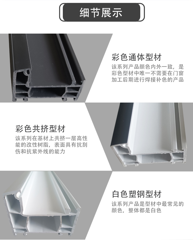 四川太萌塑鋼門窗型材廠家生產的60推拉框顏色有:白色、單、雙面共擠、通體彩色、型材壁厚多種。