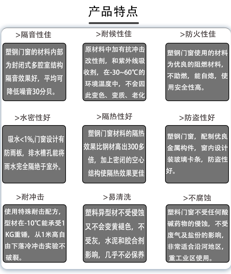 公司開發生產的塑鋼型材現有60平開和推拉系列、80推拉系列、88推拉系列,可制作固定、內外平開、推拉、上懸窗、下懸窗、百葉窗等,品種規格齊全。采用新技術、新配方,確保產品色澤一致,以及采用先進焊接平整工藝,使結構更堅固、質量更放心。本系列產品是以塑代木、代鋼、代鋁的“第四代門窗”,具有防火阻燃、耐腐蝕、隔音隔熱、外觀精美、品種新穎、不易老化、不易褪色、清洗方便等特點。主要顏色有白色、灰色、咖啡色等,可根據居室裝飾的特點確保協調一致,使你家居生活更顯示尊貴。產品適用于賓館、辦公樓、家裝門窗使用,為同類產品之精品。