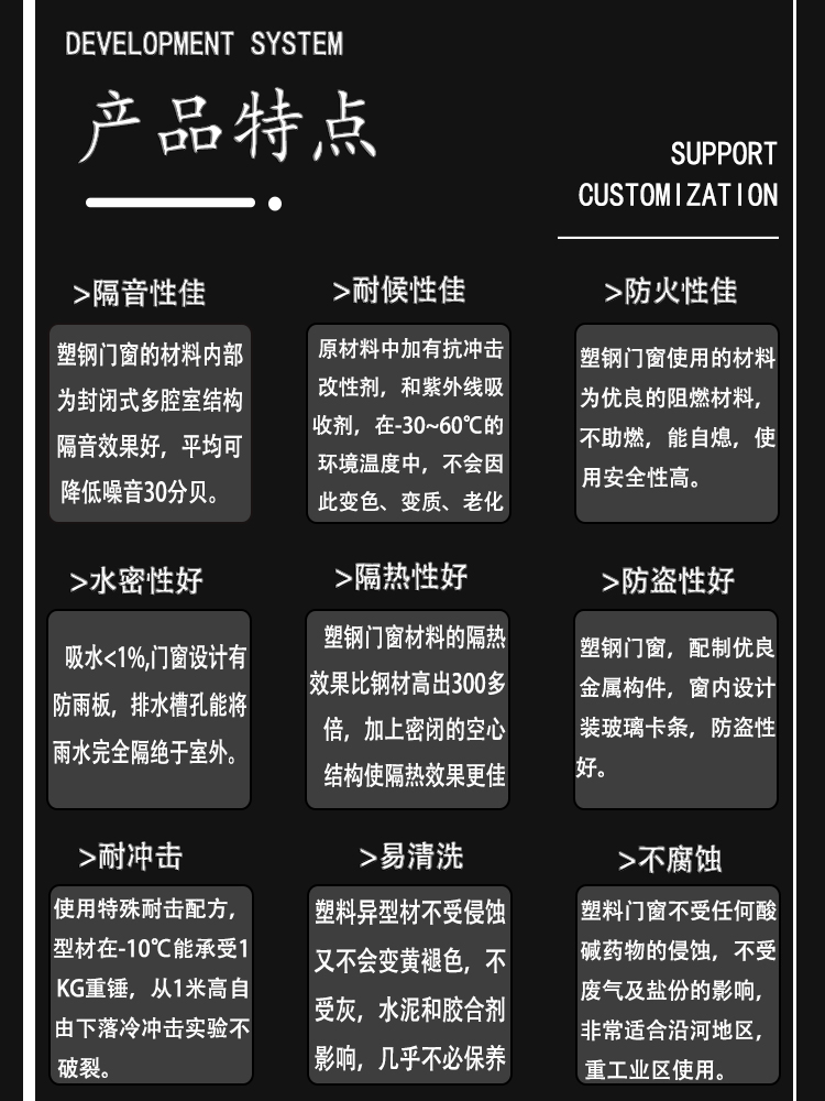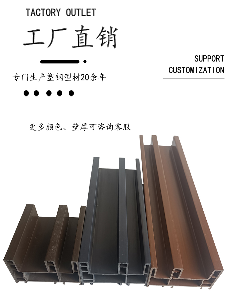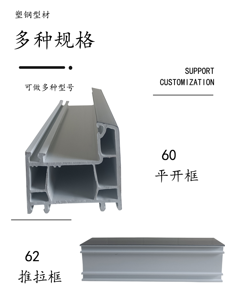 公司開發生產的塑鋼型材現有60平開和推拉系列、80推拉系列、88推拉系列,可制作固定、內外平開、推拉、上懸窗、下懸窗、百葉窗等,品種規格齊全。采用新技術、新配方,確保產品色澤一致,以及采用先進焊接平整工藝,使結構更堅固、質量更放心。本系列產品是以塑代木、代鋼、代鋁的“第四代門窗”,具有防火阻燃、耐腐蝕、隔音隔熱、外觀精美、品種新穎、不易老化、不易褪色、清洗方便等特點。主要顏色有白色、灰色、咖啡色等,可根據居室裝飾的特點確保協調一致,使你家居生活更顯示尊貴。產品適用于賓館、辦公樓、家裝門窗使用,為同類產品之精品。