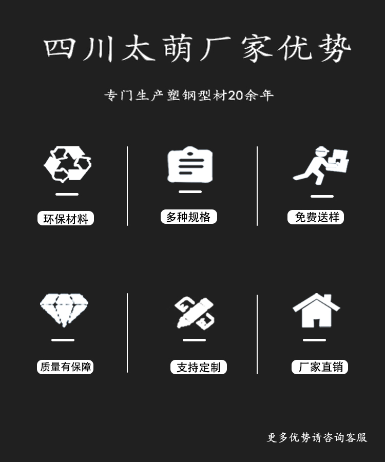 四川太萌塑鋼型材科技有限公司以“創新、規范、正向、陽光”的企業形象,本著“為員工造福、與客戶共贏、為社會貢獻”的企業使命,為了公司的3-3-4計劃而誠信經營、追求卓越。客戶的要求是我們服務的標準,物超所值是我們共同的目標。“和時間賽跑,與時代同步”,把握現在、挑戰未來、創造機會,公司真誠與您共創輝煌!