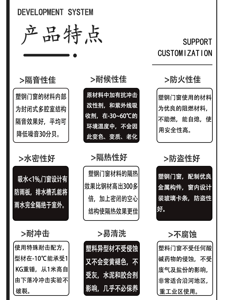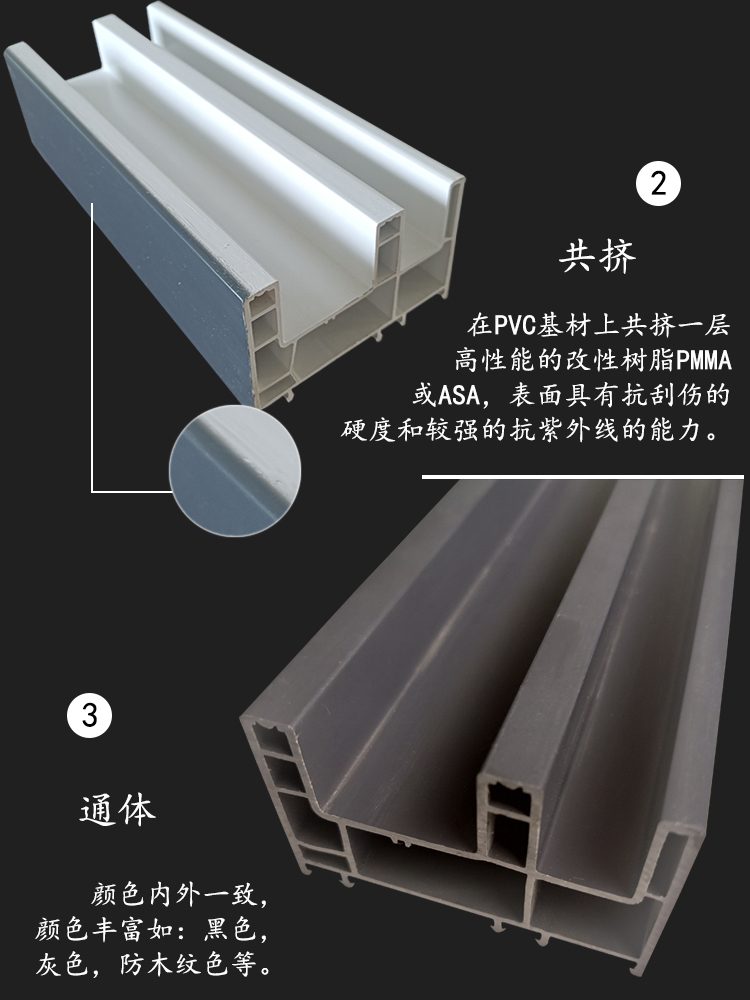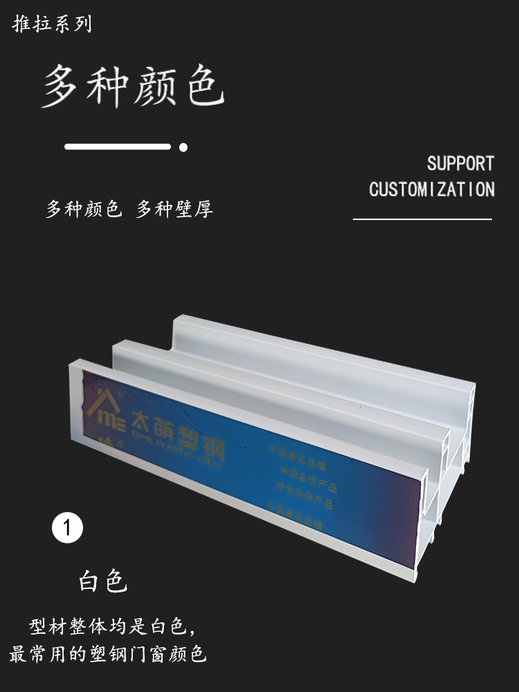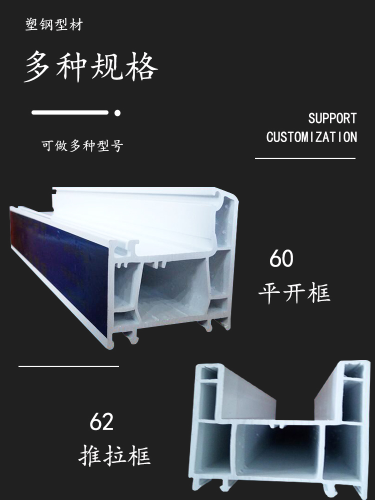 公司開發生產的塑鋼型材現有60平開和推拉系列、80推拉系列、88推拉系列,可制作固定、內外平開、推拉、上懸窗、下懸窗、百葉窗等,品種規格齊全。采用新技術、新配方,確保產品色澤一致,以及采用先進焊接平整工藝,使結構更堅固、質量更放心。本系列產品是以塑代木、代鋼、代鋁的“第四代門窗”,具有防火阻燃、耐腐蝕、隔音隔熱、外觀精美、品種新穎、不易老化、不易褪色、清洗方便等特點。主要顏色有白色、灰色、咖啡色等,可根據居室裝飾的特點確保協調一致,使你家居生活更顯示尊貴。產品適用于賓館、辦公樓、家裝門窗使用,為同類產品之精品。
