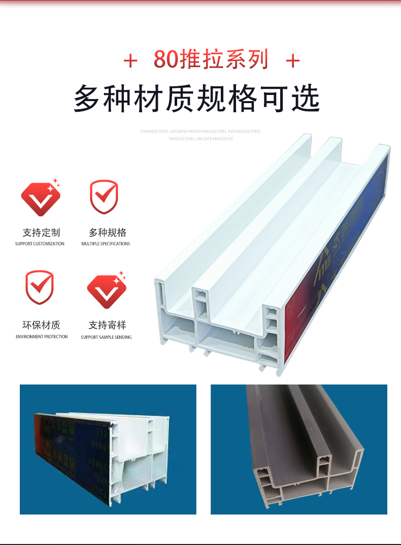 公司開發(fā)生產(chǎn)的塑鋼型材現(xiàn)有60平開和推拉系列、80推拉系列、88推拉系列,可制作固定、內(nèi)外平開、推拉、上懸窗、下懸窗、百葉窗等,品種規(guī)格齊全。采用新技術(shù)、新配方,確保產(chǎn)品色澤一致,以及采用先進焊接平整工藝,使結(jié)構(gòu)更堅固、質(zhì)量更放心。本系列產(chǎn)品是以塑代木、代鋼、代鋁的“第四代門窗”,具有防火阻燃、耐腐蝕、隔音隔熱、外觀精美、品種新穎、不易老化、不易褪色、清洗方便等特點。主要顏色有白色、灰色、咖啡色等,可根據(jù)居室裝飾的特點確保協(xié)調(diào)一致,使你家居生活更顯示尊貴。產(chǎn)品適用于賓館、辦公樓、家裝門窗使用,為同類產(chǎn)品之精品。